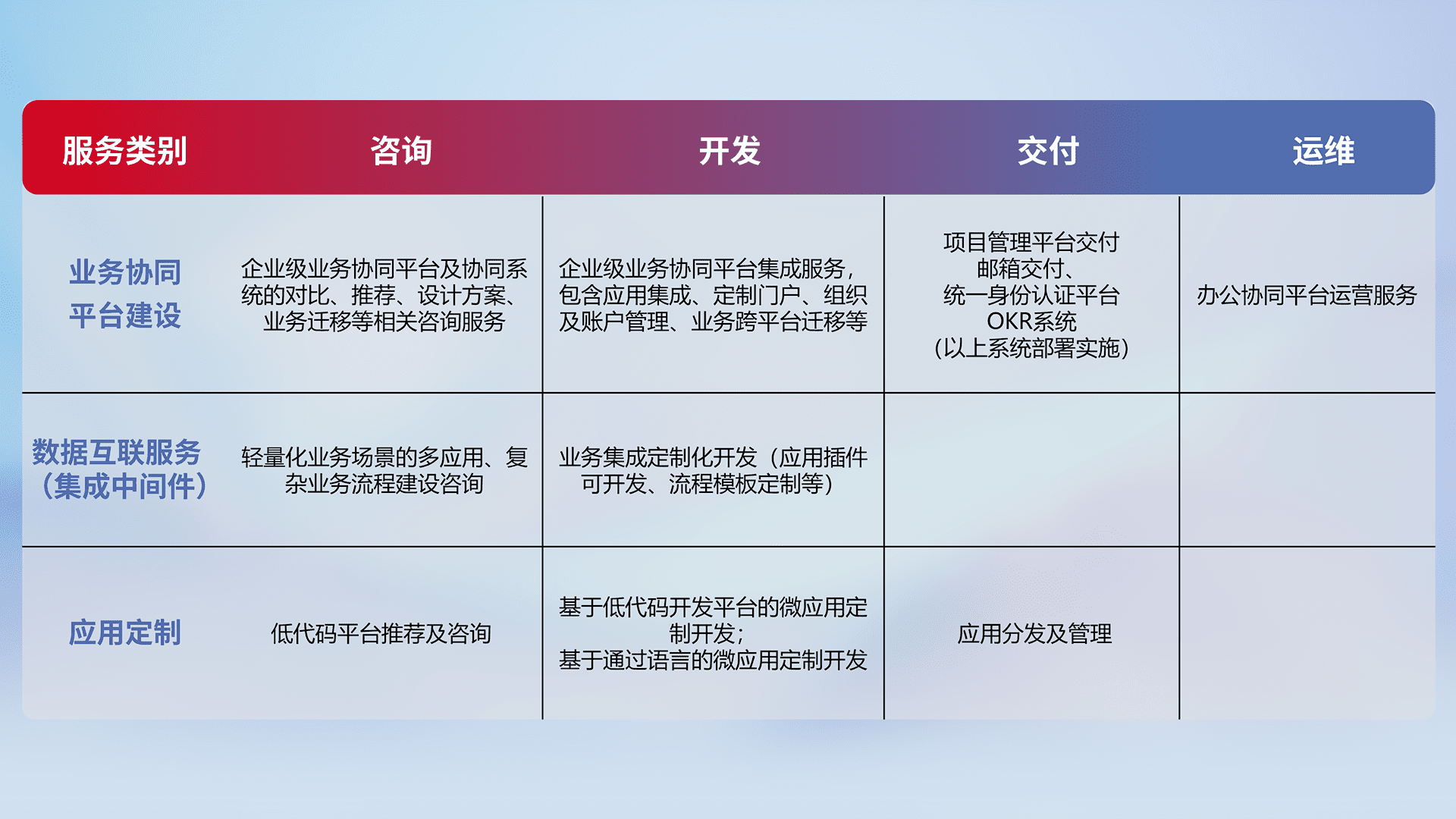 针对钉钉、、、企微、、、IDaas等平台级产品提供产品的规划、、、方案、、交付、、定制化开发等服务,,,实现如统一协同办公、、智能客户服务、、、混合会议管理、、智能数据查询、、、等业务场景,,实现数字化转型。。。。